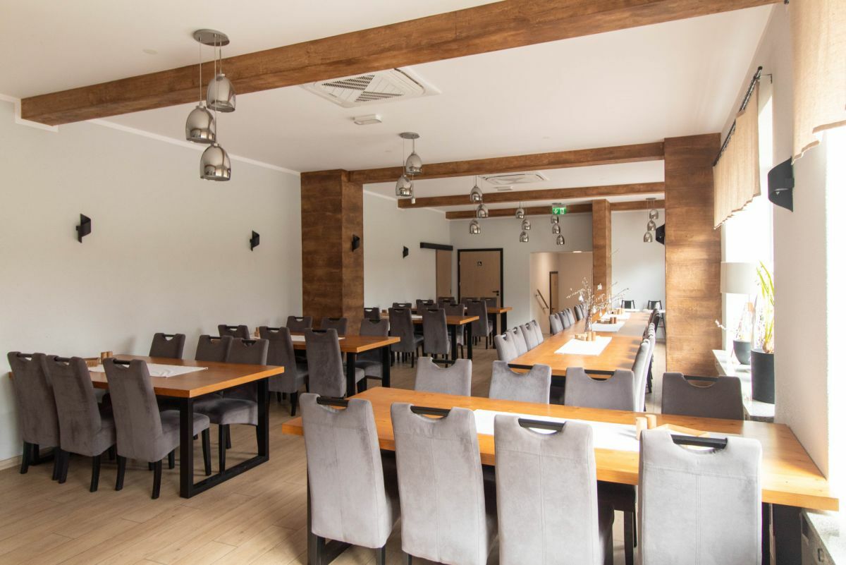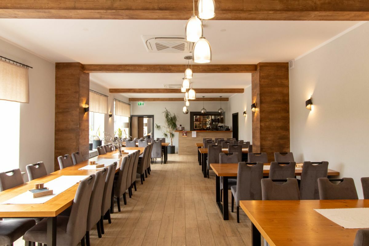 Parter (318,10 m²): Profesjonalna strefa restauracyjna z pełnym zapleczem kuchennym, magazynowym i socjalnym. Przestrzeń została zmodernizowana o dodatkowe klimatyzatory sufitowe oraz powiększony okap nad blokiem kuchennym.