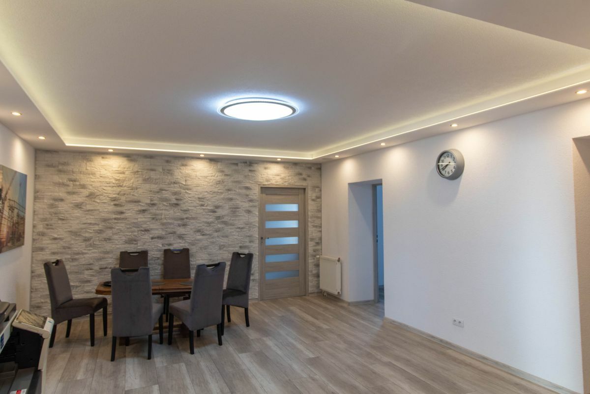 Wykończenie wnętrz: Tynki cementowo-wapienne kat. III, gładzie gipsowe, a na podłogach trwałe płytki gresowe, ceramiczne oraz panele.